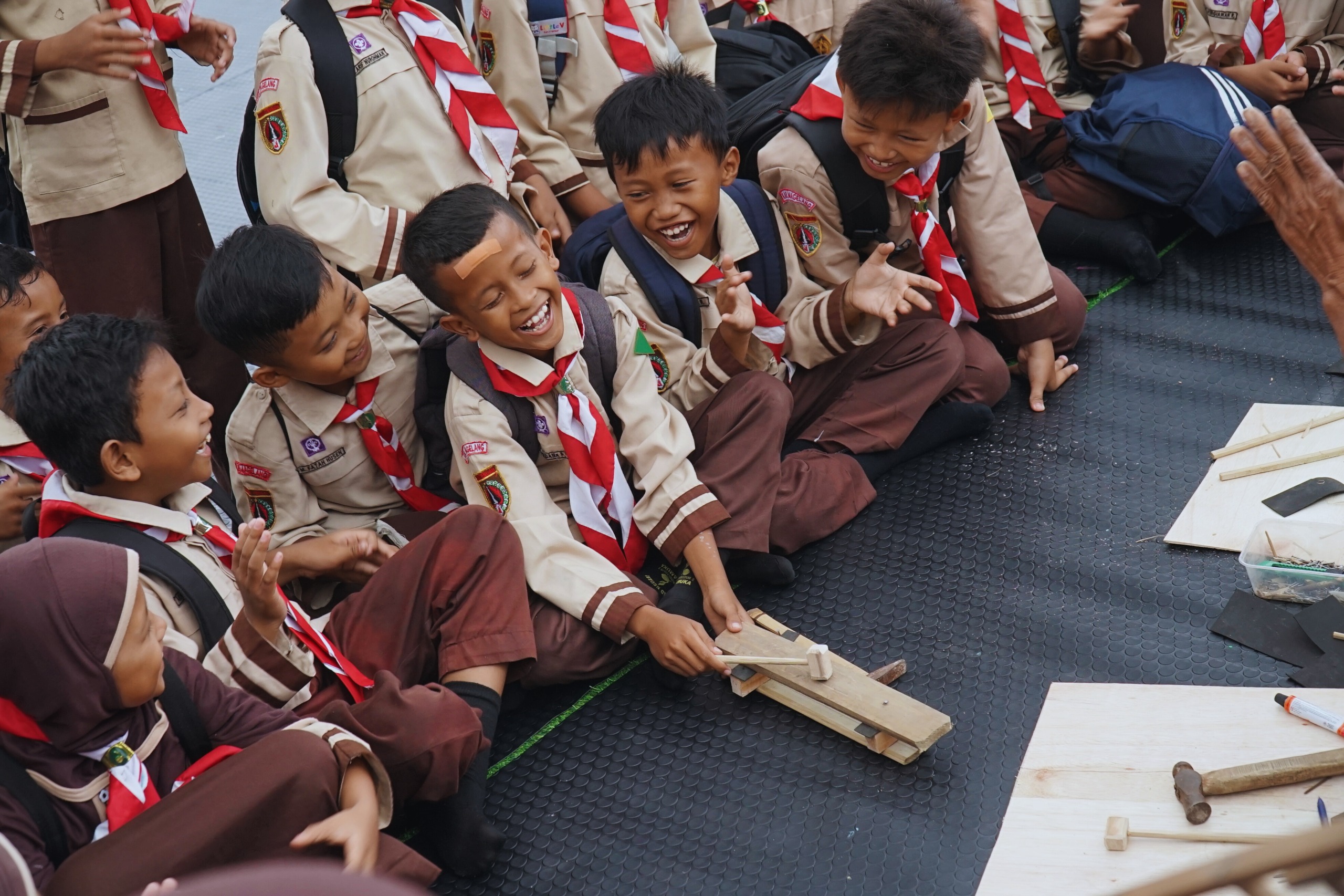 “Ini kali pertama aku mengikuti workshop kayak gini, seru pastinya, seru banget. Apalagi kita berinteraksi sama anak-anak yang ceria, jadi kita ikut ceria juga, happy,” ujar Edi, peserta umum workshop melukis di atas gasing.